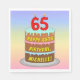 Cette conception amusante et colorée de serviette en papier à thème d'anniversaire présente une représentation de style dessin animé d'un gâteau d'anniversaire à trois niveaux avec des bougies en forme de chiffre sur le dessus montrant l'âge "65", avec le message "HAPPY 65TH BIRTHDAY," et un nom de destinataire personnalisable. L'arrière - plan a un motif multicolore pastel en arc-en-ciel inspiré du spectre dégradé. Des serviettes en papier comme celles-ci pourraient être utilisées à une fête pour quelqu'un qui célèbre son 65e anniversaire. [~Z0000623]