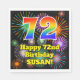 Cette conception joyeuse et excitante de serviette en papier d'anniversaire dispose d'un grand nombre "72" avec un motif coloré de gradient de spectre arc-en-ciel inspiré. Il comporte également le message "Happy 72nd Birthday," et un nom personnalisé. L'arrière - plan est décoré d'un motif vibrant et coloré, inspiré par l'apparition de feux d'artifice festifs éclatants. Des serviettes en papier comme celle-ci peuvent être utilisées lors d’une fête d’anniversaire organisée pour célébrer le 72e anniversaire de quelqu’un. [~Z0000574]
