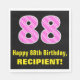 Cette conception amusante et joyeuse de serviette en papier à thème d'anniversaire comporte un grand numéro "88" avec un motif rayé rose foncé et rose clair contenant des formes cardiaques. Il comporte également le message de voeux d'anniversaire "Joyeux 88e anniversaire", et un nom personnalisé. Des serviettes en papier comme celle-ci pourraient être agréables à avoir lors d’une fête en l’honneur du 88e anniversaire de quelqu’un. Cela pourrait aussi être un choix amusant pour quelqu'un dont l'anniversaire tombe le jour de la Saint-Valentin (14 février), en raison de ses symboles et couleurs de coeur affectueux. [~Z0000436]