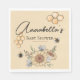 Ces serviettes personnalisées sont décorées sur le thème des abeilles et des fleurs. Un bouquet floral de tournesols est représenté en bas avec deux petites abeilles qui les entourent. Un peigne de miel illustre la zone de texte. Un exemple de nom est imprimé dans une police de script élégante au-dessus d'un exemple de nom d'événement Baby shower. L'arrière - plan est d'une couleur jaune miel crémeuse et chaude.