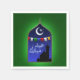 Illustration de l'Aïd Moubarak avec une scène nocturne festive : une guirlande colorée, la lune et les étoiles et une silhouette d'une mosquée exposée dans une fenêtre arabe sur un arrière - plan à motifs verts.