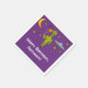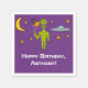 Jetez une fête d'anniversaire hors du monde avec ces serviettes personnalisées illustrant l'illustration d'un alien de l'espace vert citron tenant une paire de ballons en forme de planète.