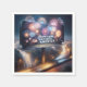 A large billboard displays vibrant fireworks and the message "Happy 250th Birthday, America" against a nighttime cityscape