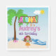 Plage tropicale Luau anniversaire serviettes en papier personnalisées, avec jolie hula girl, palmier et scène de plage, avec texte facile à customiser. Terminez votre soirée d'été avec ce panneau customisé, idéal pour les enfants ou les adultes.