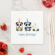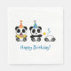 Trois adorables petits pandas en casquettes d'anniversaire assis l'un à côté de l'autre. Un heureux panda porte un tee - shirt avec "I heart panda" écrit dessus. Un autre offre un bonbon à un troisième panda qui s'est endormi.