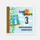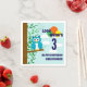 Regarde qui a un anniversaire ! Chouette bleue amusante dans une scène boisée avec ciel bleu et nuages moelleux