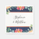 Ces serviettes mariages personnalisées sont ornées de fleurs de corail d'aquarelle moderne avec du feuillage et des feuilles sur un arrière - plan de marine. Personnalisez-les avec vos noms et votre date de mariage. Des invitations de mariage, des articles de papeterie et de réception sont également disponibles.