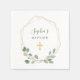 Ces serviettes Baptistes ou Christening, tendance et élégantes, sont ornées d'une couronne de feuilles d'eucalyptus vert et aquarelle et d'un cadre géométrique en faux or sur un arrière - plan blanc. Ce look neutre de genre a aussi une fausse croix d'or correspondant.