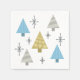 Un design moderne festif du milieu du siècle avec des arbres de noël de style ère atomique en or, argent et bleu clair, et des étoiles.