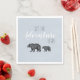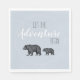 Serviettes de fête baby shower rustique avec des ours qui marchent avec la phrase : "laissez l'aventure commencer", contre un arrière - plan pastel gris-bleu doux. Maman, et bébé. personnalisez pour votre fête.