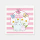 Serviettes en papier avec arrière - plan rayé rose et blanc. Un cadre circulaire blanc avec une bordure rose superposée avec votre texte personnalisé à l'intérieur. A l'intérieur du cadre une illustration d'une mère et un bébé lapin debout ensemble. Bouches jaunes dans l'arrière - plan. Des papillons géants.