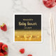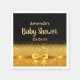 Une serviette élégante et glamour pour baby shower neutre pour les hommes et les femmes. Arrière - plan brillant noir et doré classique avec un faux ruban d'or et arc. Modèle pour le nom de la mère à être, la date du baby shower et le texte : Baby shower. Lettres d'or.