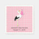Serviettes en papier baby shower sucrées faites dans un motif à chèques en vichy rose et blanc, avec des graphiques mignons d'une cigogne tenant un paquet de bébé rose. Personnalisez le texte noir pour votre événement baby shower. Des plaques de coordination et des invitations en papier sont disponibles.