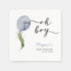 Serviette en papier baby shower à thème pour ballon rustique et moderne avec aquarelle illustrant un ballon bleu avec guirlande verte. Le texte dit "oh mon garçon."