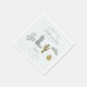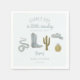 La serviette en papier de baby shower à thème rustique cowboy illustrant une botte de cowboy, un casquette, un cactus et un serpent. Le texte dit : "Saddle up a little cowboy is on the way."