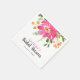 Napserviettes de baby shower brillantes, colorées et modernes représentant un grand bouquet de fleurs aquarelles en rose tropical, orange et vert. Le nom de la mariée est en rose fuchsia et "baby shower" est en noir dans un style moderne à la brosse. Également disponibles, les articles assortis