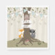 serviettes de baby shower illustrant un arbre aux feuilles verts et aux racines apparentes. Un renard et un raton laveur s'assoient de chaque côté du coffre et une chouette s'assoit sur une bannière enroulée autour du coffre qui dit : "C'est un garçon !" Le Bunting est blanc et bleu.