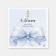 Couleur arrière - plan bleu clair. Décoré d'un grand arc bleu, de fleurs et d'une croix d'or. Personnalisez et ajoutez le nom et la date.