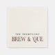 Le texte "Brew & 'Que" est imprimé à l'aide d'une police vintage en brun foncé et rouge. Au-dessus de ces mots se trouve un modèle où vous pouvez personnaliser les serviettes avec votre nom, la date de l'événement ou tout autre texte personnalisé. Idéal pour les jardins d'été, les cocktails ou les barbecues.