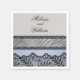 Cette beauté bleue et dos présente un arrière - plan argenté avec le nom du couple écrit en noir cursif. Sous l'image du ruban de dentelle, et sous celle-ci est une autre image de dentelle noire combinée à la couleur bleue. Commandez dès aujourd'hui !