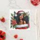 This botanical Christmas theme napkin set features a smiling Black woman wearing a Santa hat and Santa-inspired dress, framed by hollies and poinsettia plants, highlighting the X-mas holiday theme. A melanin-rich festive design in classic red and green color scheme!