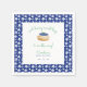 Il s'agit d'une serviette de baby shower personnalisable avec un charmant thème de bleuets. La décoration est composée d'une bordure bleue ornée de fleurs blanches ressemblant à des marguerites, encadrant un carré blanc central. A l'intérieur du carré, on voit l'illustration d'un dessert aux bleuets aux feuilles verts, ajoutant une touche ludique et douce. Le texte, écrit dans un mélange de polices cursives et imprimées, dit : "Un doux garçon aux baies est en route !" Ci-dessous, dans une police complémentaire, il affiche le nom de l’honoraire et la date de l’événement. La serviette a une esthétique fraîche, fantaisiste et ludique, parfaite pour un baby shower à thème de bleuets ou de fruits. Il est personnalisable, permettant de personnaliser le nom et la date pour s'adapter à n'importe quelle célébration.