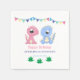 Mignonne serviette en papier d'anniversaire de dinosaure avec deux heureux dinosaures garçons et filles avec plante jungle et drapeaux colorés.