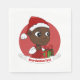 Serviettes avec l'illustration d'un joli sourire joyeux bébé fille ou garçon noir, le bébé porte des vêtements rouges et blancs et tient un cadeau; avec texte modifiable modèle pour votre nom ou message, Noël fêtes design