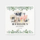Des serviettes de fête d'anniversaire de la ferme pour enfants mignonnes avec un arrière - plan blanc simple, un élégant feuillage d'eucalyptus, d'adorables animaux de ferme en aquarelle comprenant une vache, un porc, un mouton, un chien, un poulet, un lapin, un canard et un coq, et un modèle texte facile à customiser.