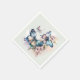 Des serviettes en papier avec un trio de papillons flottant parmi de jolies fleurs. Couleurs bleu rose et vert.