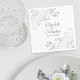 Ces belles serviettes feront de votre réception de mariage quelque chose de spécial. Elles présentent un design simple mais élégant avec du texte gris sur un arrière - plan blanc avec des boucles et des tourbillons en faux feuille argent en dentelle dans les coins. Personnalisez facilement avec vos noms et la date du mariage.