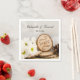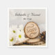 Emmenez-vous en plein air lorsque vous personnalisez les charmantes serviettes en papier Mariage Rustique White Daisies avec le nom personnel de la mariée et du marié et date à utiliser à votre thème naturel douche nuptiale ou réception de mariage. Ces bois botaniques décontractés mais élégants ou serviettes jetables de la forêt inspeco disposent d'une photo florale de fleurs marguerites, cônes de pin brun, voile de mariée blanche et tranche de bois avec le mot LOVE brûlé sur elle avec un arrière - plan burlap.