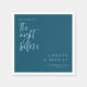 Dîner de répétition minimaliste pour mariage serviette de bienvenue avec texte écrit à la main qui dit "bienvenue à la veille". La couleur est en bleu turquoise.