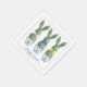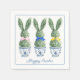 These Easter paper party napkins feature cute bunny rabbit green topiaries with pink, blue and yellow bows in blue and white chinoiserie flowerpots. Personalize the holiday message with your choice of special text.