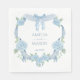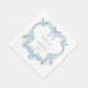 Blue Hydrangea Watercolor Crest Paper Wedding Napkins. Celebrate your special day with these elegant blue hydrangea crest paper wedding napkins. Featuring a delicate dusty blue watercolor floral wreath with a charming blue bow and ribbon, these napkins add a touch of French romantic charm to any wedding reception. The customizable design allows you to add your names and wedding date, making them a unique keepsake for your guests. Perfect for spring or summer weddings, these napkins create a cohesive and memorable dining experience. Great for the bar or dessert table too!