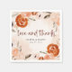Ces belles et romantiques serviettes de mariages ou de douches nuptiales présentent un style boho tendance et une élégante calligraphie bordeaux qui dit "amour et merci". Des bouquets bohèmes rustiques de fleurs orange, pêche, rougies et taupes et des feuilles botaniques neutres décorent le cadre, avec des éclaboussures d'aquarelle assorties sur un arrière - plan moelleux.
