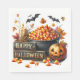 Ajoutez du charme Whimsical à votre table de Fêtes Festive avec cette adorable serviette en papier Halloween. L'oeuvre d'art comporte un cauldron plein de Corn à bonbons. Les feuilles d'automne tombent et le ciel de nuit est plein de chauves-souris. Un Jack-o-lanterne fixe la scène d'automne alors qu'une bougie clignote. Le verset dit : "Heureux Halloween."