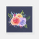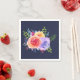Des serviettes en papier avec un joli bouquet de roses aquarelles avec des sprigs, des feuilles et des branches, le tout dans un arrangement floral coloré. Arrière - plan bleu marine.