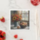 Un bouquet de fleurs d'automne dans un vieux métal peut se vaser assis sur une table recouverte de dentelle à côté d'un bol de pommes, éclairé par une lumière douce qui traverse une ferme voisine.