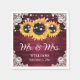 Des serviettes en papier mariage bordeaux personnalisées ornées de tournesols sur un arrière - plan en bois de grange ornées de dentelles florales blanches et de lampes à cordes. Éléments correspondants disponibles.