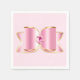 Serviettes en papier avec un arc brillant avec contour doré et une pierre rose à facettes au centre. Style luxe féminin glam style.