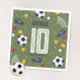 These cool and modern soccer-themed kids napkins feature a vibrant green background with playful illustrations of a football (soccer ball), trophies, stars, goals, and soccer boots. Personalize the text to suit any age. Perfect for boys’ soccer birthday parties!