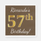 Ce design simple de serviette en papier comporte un message comme "57e anniversaire de Riccardo!", avec le "57e" à l’allure d’un faux or, sur un arrière - plan de couleur marron. Le nom peut être personnalisé. Il pourrait être utilisé lors d'une fête d'anniversaire pour quelqu'un qui célèbre son cinquante-septième anniversaire. [~Z0000082]