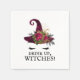 Les serviettes idéales pour votre soirée Halloween ou enterrement de vie de jeune fille sur le thème d'Halloween. Il présente un visage de sorcière mignon (un chapeau de sorcière en velours rouge burgundy avec un bouquet de roses rouges et de feuilles de chêne noir sur une paire de cils noirs au repos). En dessous, le texte noir indique "Buvez tout, sorcières !" dans une police suffisamment effrayante.