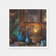 Une scène cabine rustique et cosy avec un bureau avec plumes de paon dans un vase en cuivre, poteries bleues, livres et lampe à kérosène. Le clair de lune est visible à travers le gel hivernal sur les vitres.