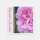 Belles serviettes mariages avec une photo d'une jolie fleur de Camellia rose avec un motif en ruban rose et blanc. Customisez avec vos propres noms.