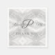 Design présente un faux satin blanc arrière - plan au monogramme du couple nouvellement marié. Centre affiche l'initiale du nom de famille dans une grande police élégante en argent. La première initiale de mariée et mariée est affichée de chaque côté dans la même police, mais plus petite. Les mots "MERCI" sont présentés ci-dessous. L'intérieur est laissé vide.