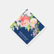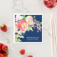 Un bouquet floral et en rotin clair et coloré se trouve en haut à gauche de ces jolis serviettes en papier mariage. Les couleurs du bouquet sont le rose corail, le rose violet clair, le blanc, le jaune pâle et l'or, et le vert, avec une touche de bleu aqua. Il présente votre texte personnalisé en blanc au centre. L'image est placée sur un arrière - plan bleu marine dramatique. Votre texte personnalisé est en blanc en bas. Ces jolies serviettes sont suffisamment polyvalentes pour être utilisées pour des évènements variés, surtout au printemps et en été, ou tout autre événement à thème tropical. Il y a des invitations de mariage assorties et d'autres produits mariages dans notre magasin.