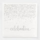 Papier Dîner serviette avec parties scintillant argent et le texte "célébration". Le texte est dans un scriptfont avec un glyphe tourbillon au début et à la fin. Cette serviette est polyvalente et peut être utilisée pour de nombreuses occasions comme le Nouvel An, Anniversaire, Anniversaire et autres. Il est facile d’associer ce design monochrome à d’autres décorations et effets en argent et blanc.