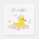 Petit canard en caoutchouc jaune mignon nageant dans des bulles roses avec les mots It's a Girl for the baby shower.